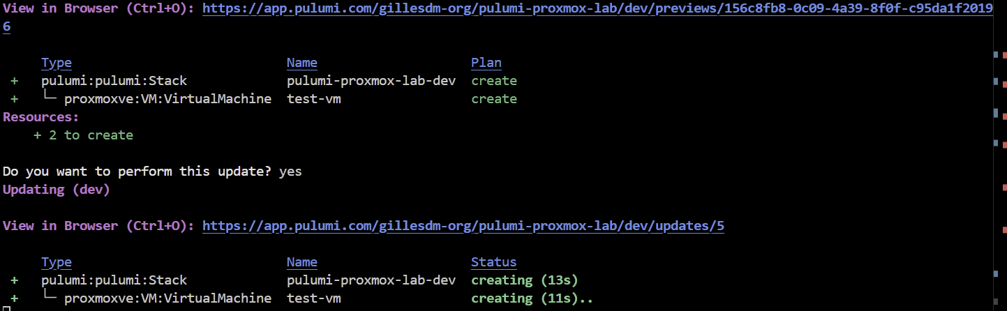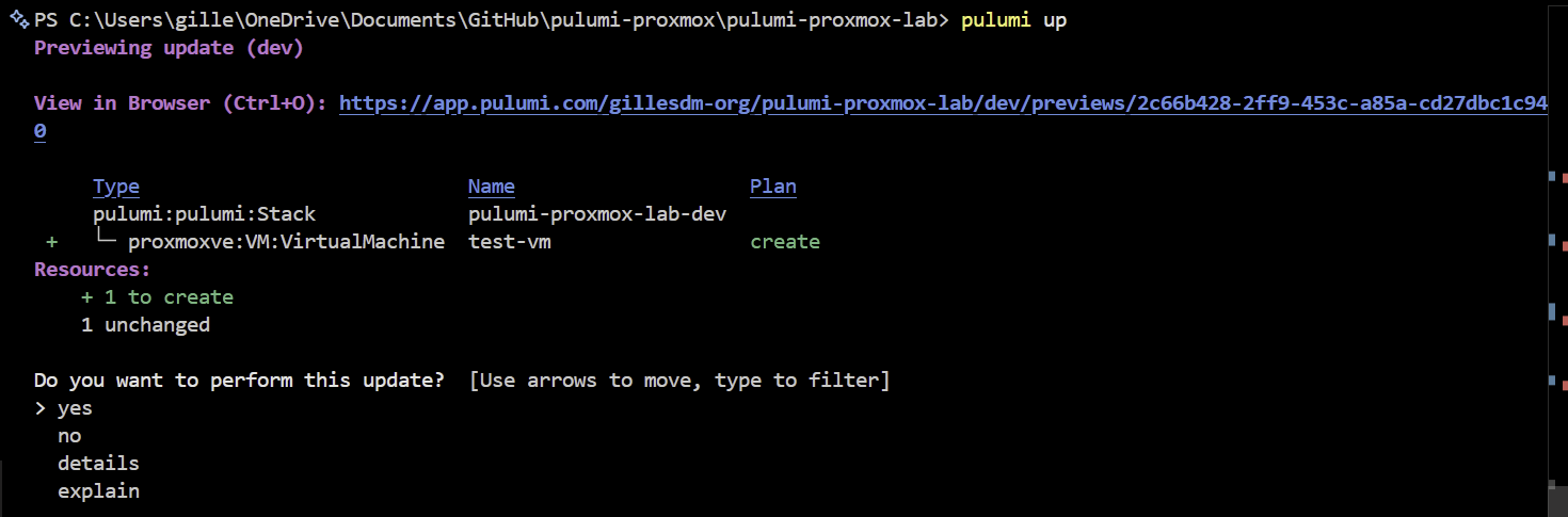 pulumi upYou will be prompted if you want to execute this, move to yes with the arrows on your keyboard and click enter.